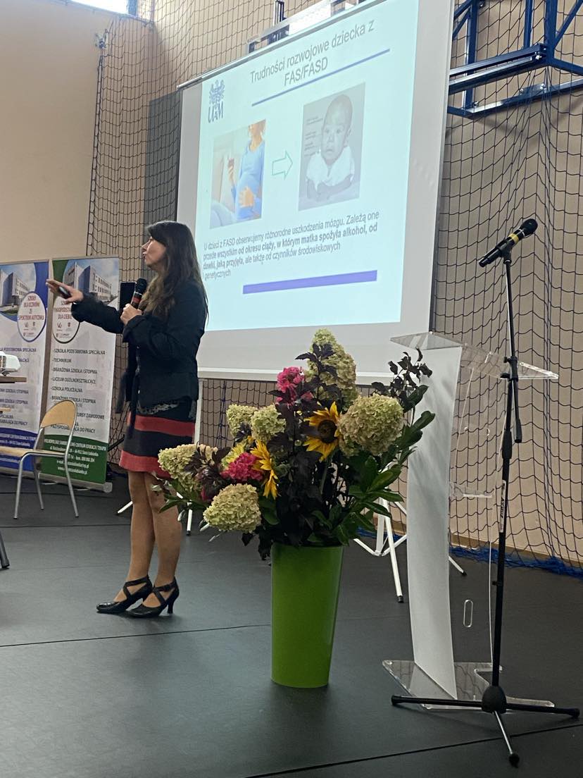 Część oficjalną rozpoczęła Dyrektor WSCEiT Pani Anna Kubiak, która serdecznie powitała zaproszonych gości oraz uczestników, wśród których byli przedstawiciele pomocy społecznej i wymiaru sprawiedliwości, pracownicy służby zdrowia, nauczyciele, pedagodzy psycholodzy, terapeuci oraz rodzice i opiekunowie dzieci z FASD. Następnie głos zajęła Pani Katarzyna Kretkowska, Członkini Zarządu Województwa Wielkopolskiego oraz Pani Dorota Kina, Dyrektor Departamentu Edukacji i Nauki Urzędu Marszałkowskiego Województwa Wielkopolskiego. Po części oficjalnej rozpoczęła się część wykładowa, podczas której specjaliści przybliżyli nam temat FASD. Jako pierwsza wystąpiła dr n. med. Małgorzata Klecka – psycholog, psychoterapeuta, doktor nauk medycznych (specjalność psychiatria dziecięca), trenerka, terapeutka (podejście zintegrowane: psychodynamiczne, neurorozwoju, terapeutka traumy metodą Somatic Experiencing), specjalista diagnostyki zaburzeń rozwojowych typu FASD, która omówiła temat “Neurorozwojowe rozumienie zaburzeń emocjonalnych w FASD”. Następnie dr n. o zdr. Iwona Palicka – doktor nauk o zdrowiu, specjalista Psychologii Klinicznej w zakresie Neuropsychologii, terapeuta metod neurorozwojowych (SI, INPP, BI, Johansen-IAS), specjalista diagnostyki zaburzeń rozwojowych typu FASD, terapeuta traumy przedstawiła temat: „Czym są zaburzenia neurorozwojowe. Miejsce FASD wśród innych zaburzeń”. Mama adopcyjna dwójki dzieci z FAS, założycielka grupy FASmisja, mgr Małgorzata Korolczuk podzieliła się swoim doświadczeniem omawiając temat– „Cud do odkrycia a nie problem do naprawienia ” – cała prawda o dzieciach z Płodowym Zespołem Alkoholowym. “FASD w praktyce sędziego rodzinnego” zaprezentowała mgr Marta Jarząbek – Słobodzian – sędzia Sądu Rodzinnego, członkini Stowarzyszenia Sędziów Rodzinnych w Polsce. Prof. UAM dr hab. Marzena Buchnat –pedagog specjalny, pedagog, socjolog. Kierownik Laboratorium Pedagogiki Specjalnej na Wydziale Studiów Edukacyjnych UAM w Poznaniu przybliżyła temat “Dziecko z FAS/FASD w systemie oświaty – szanse i zagrożenia”. Część wykładową swoim wystąpieniem zakończyła dr n. hum. Aneta Wojciechowska – pedagog specjalny, neurologopeda, pracownik naukowo-badawczy WSE UAM, adiunkt w Laboratorium Pedagogiki Specjalnej, kierownik studiów podyplomowych: Logopedia; Neurologopedia; Edukacja i rehabilitacja osób ze spektrum autyzmu. Pani doktor przedstawiła temat “FAS a ASD – kiedy jedna litera zmienia postrzeganie osoby”.